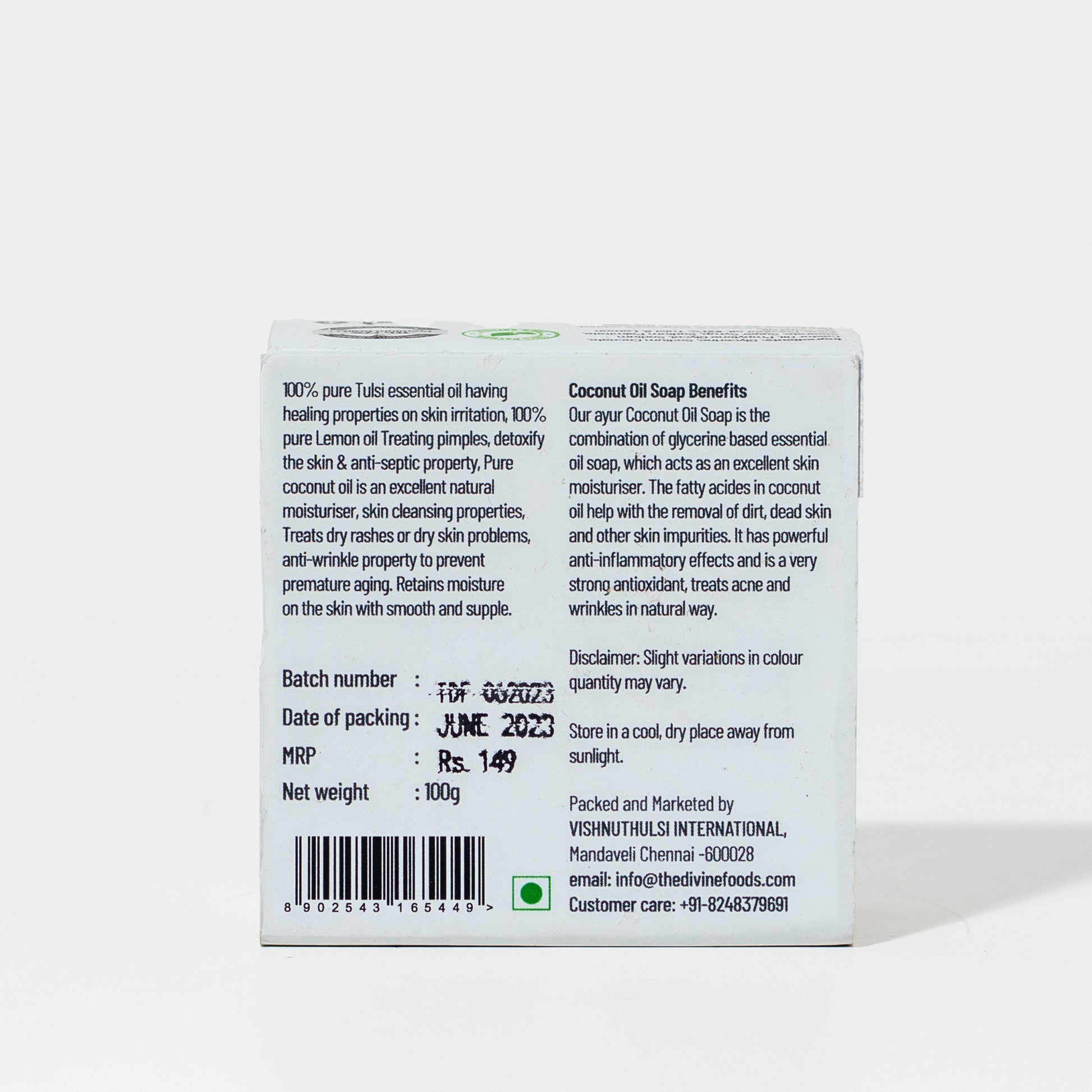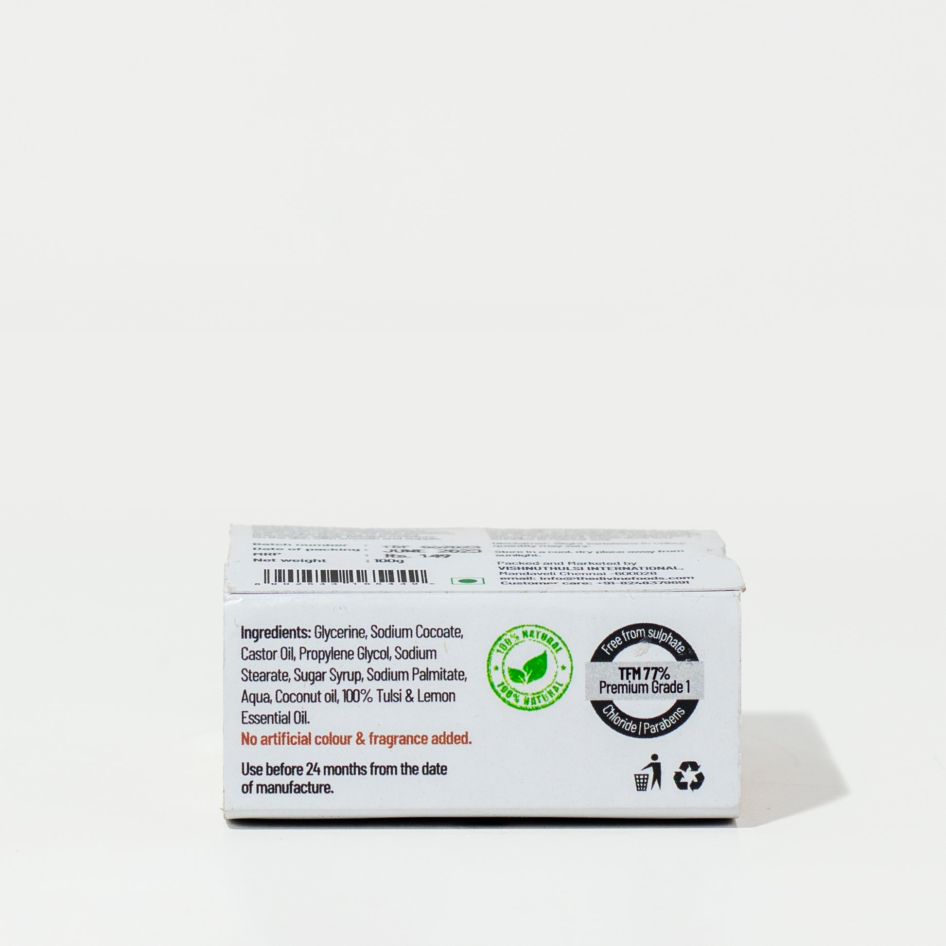 INGREDIENTS: Glycerine, sodium cocoate, castor oil, propylene glycol, sodium stearate, sugar syrup, sodium palmitate, aqua, 20ppm curcumin, tulsi, and turmeric essential oil.