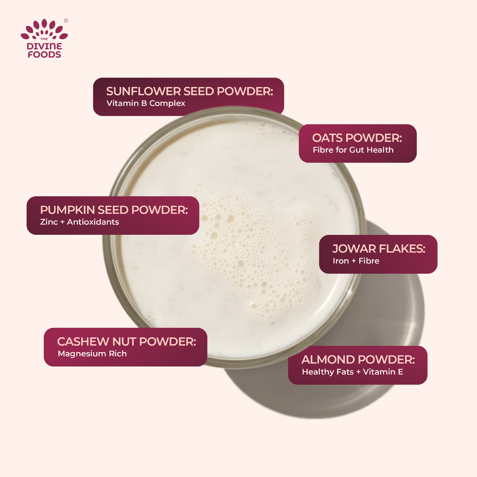 Ingredients: [Chana Sattu Powder, Oats Powder, Brown rice flake Powder, Jowar Flakes Powder, Almond Powder, Cashew nut Powder, Sunflower seed Powder, Pumpkin seed Powder]