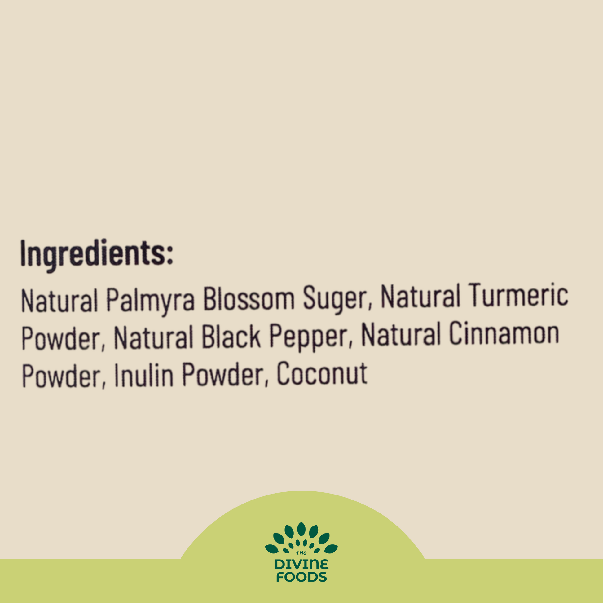 - Ingredients - Tumeric, black pepper, palm sugar, cinnamon, coconut