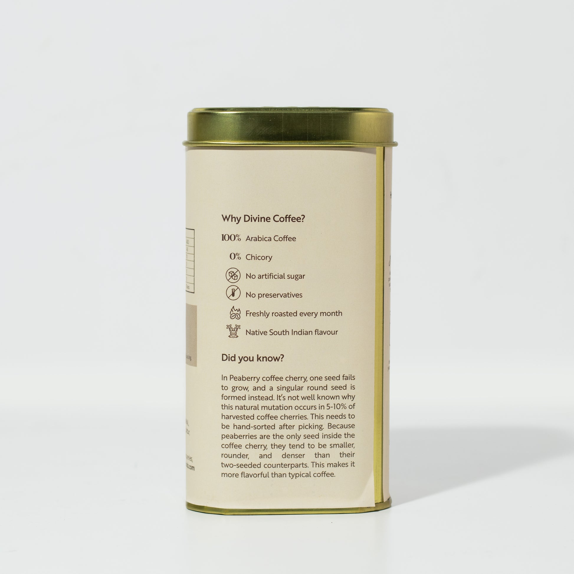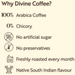 4. PACKAGING AND PURITY? : 'The Divine Foods' Premium filter coffee is 50% Peaberry and 50% Plantation A and 0% chicory is free from added additives, artificial colours, flavours, adulterants and preservatives. It is 100% pure, organic Completely natural, our products have zero preservatives and zero chemicals.