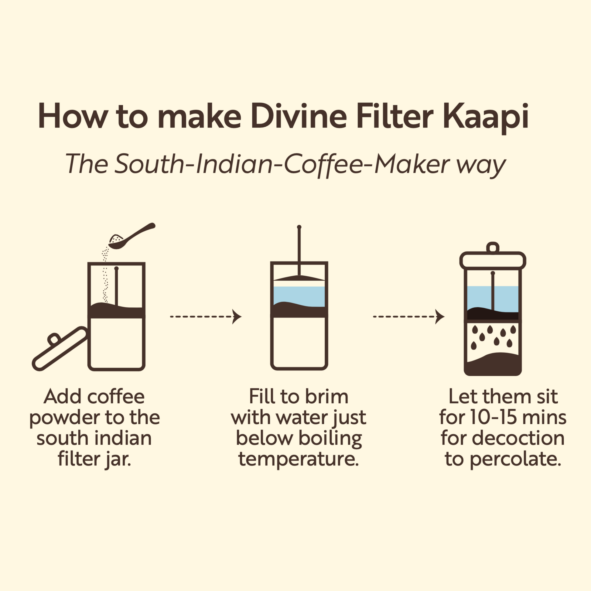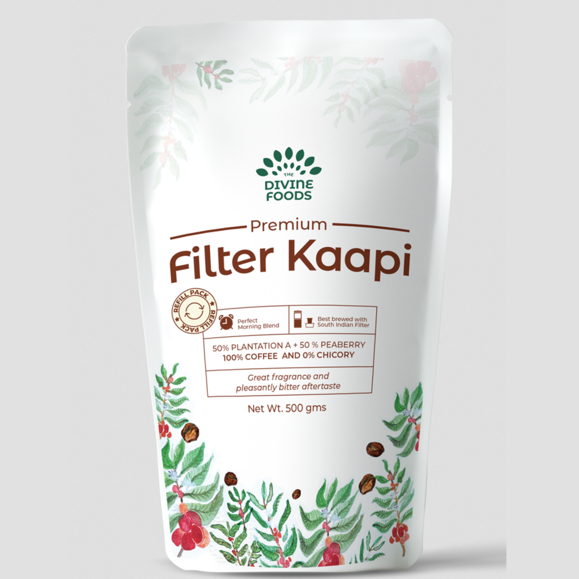 1. WHY DIVINE FOODS KAPPI?- The Divine Foods Premium Filter Coffee is carefully picked in the plantations of South India with 100% Peaberry Coffee beans and 0 % Chicory.