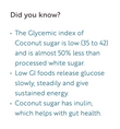 LOWER GLYCEMIC INDEX: LOWER GI than refined cane sugar has a GI of 80; honey 55 and Coconut sugar 54; The Coocnut Sugar has one of the lowest Glycemic Index.