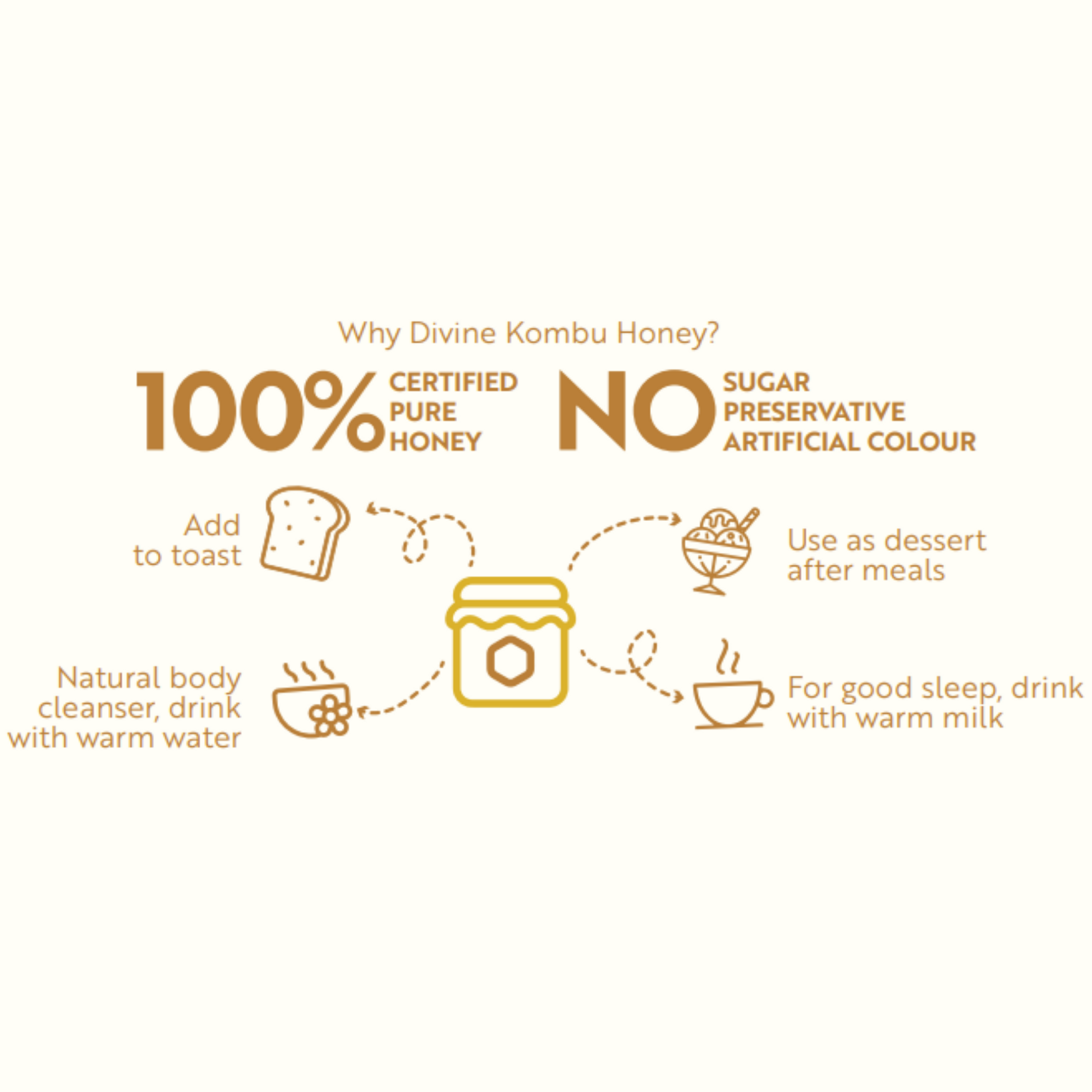 2. PURITY ?: 'The Divine Foods' Raw Unprocessed Kombu Honey is free from added additives, artificial colours, flavours and adulterants. It is 100% pure, unprocessed and has a natural taste and aroma which enhances the flavour of every dish to which it is added.