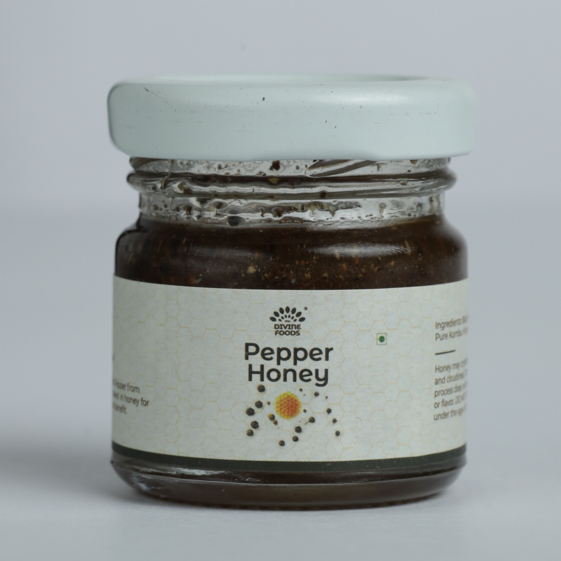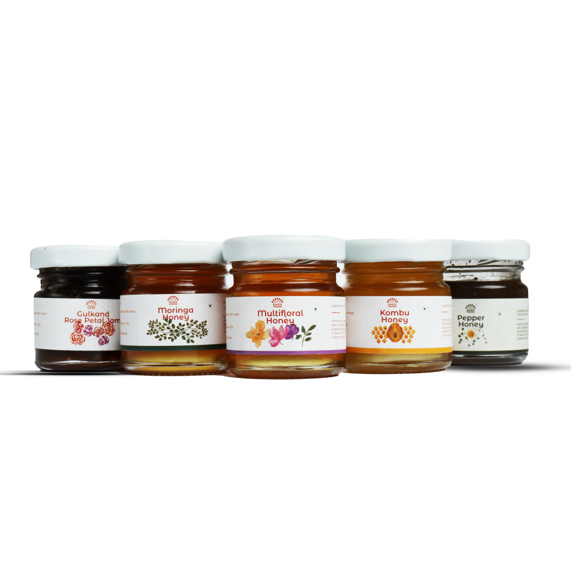 Artisanal Honey: 100% pure, 5 different types of exotic honey Multi-Floral Honey, Kombu Honey, Moringa Honey, Gulkand and Pepper Honey.