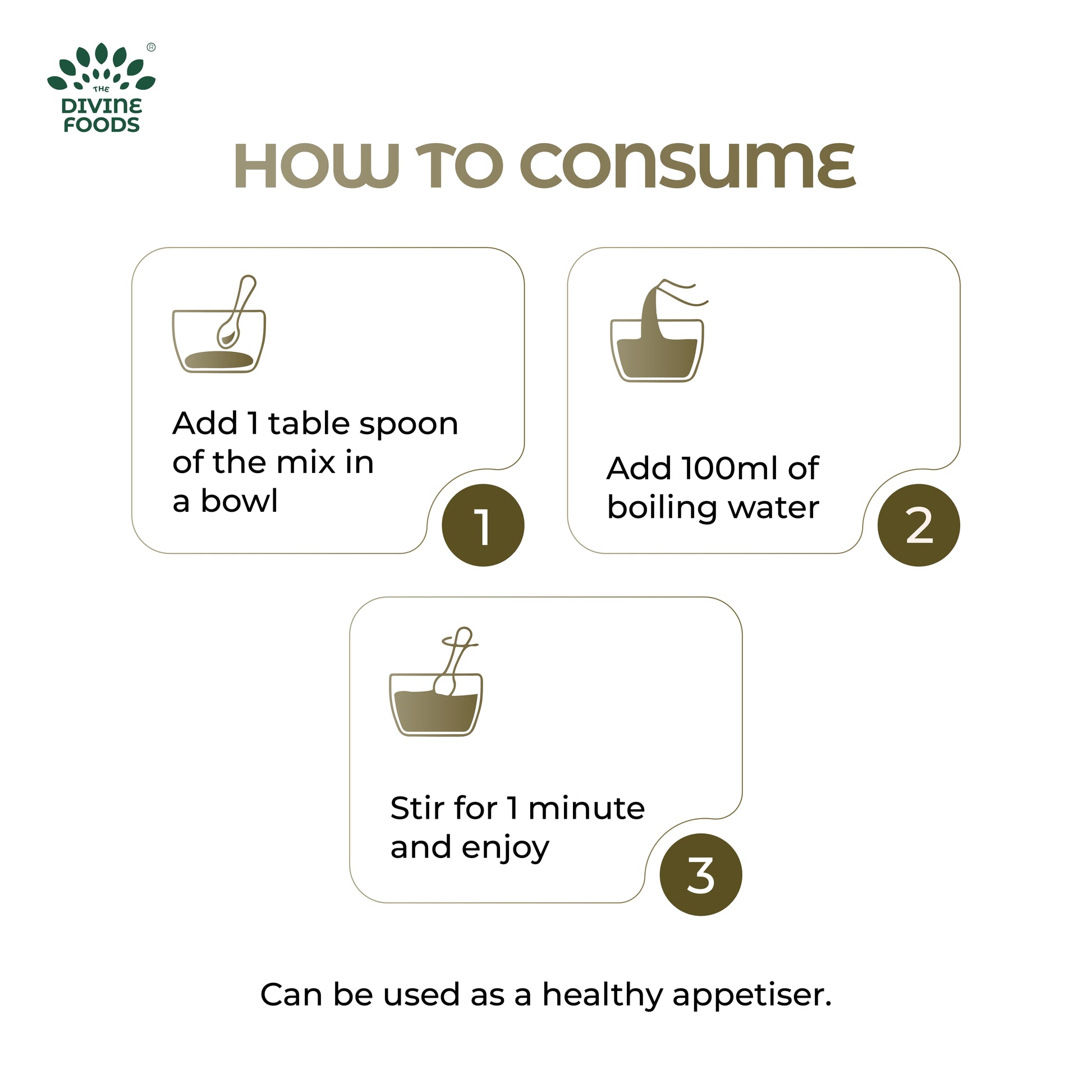 Take 6g (1 tsp) of ‘The Divine Foods’ Vallara Soup Mix. Pour 100 ml of boiling water, stir well for a minute and enjoy a wholesome soup.