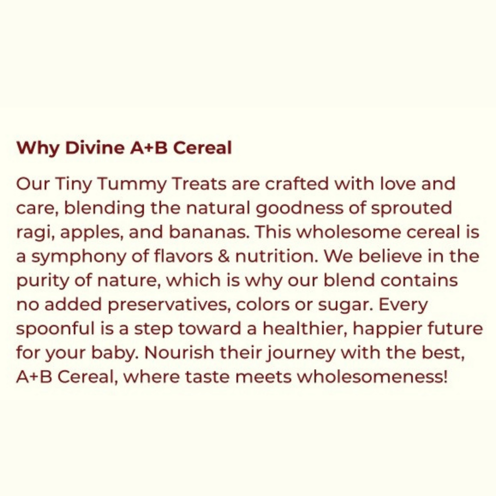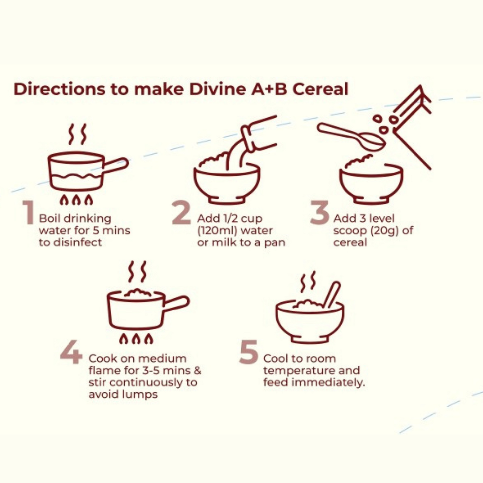1. WHY THE DIVINE FOODS A+B CEREAL? The Divine Foods A+B Cereal is Ideal for children who have started taking solid foods. All the ingredients are great origins of plant-based protein and are a powerhouse of vitamins. All the ingredients are blended perfectly.